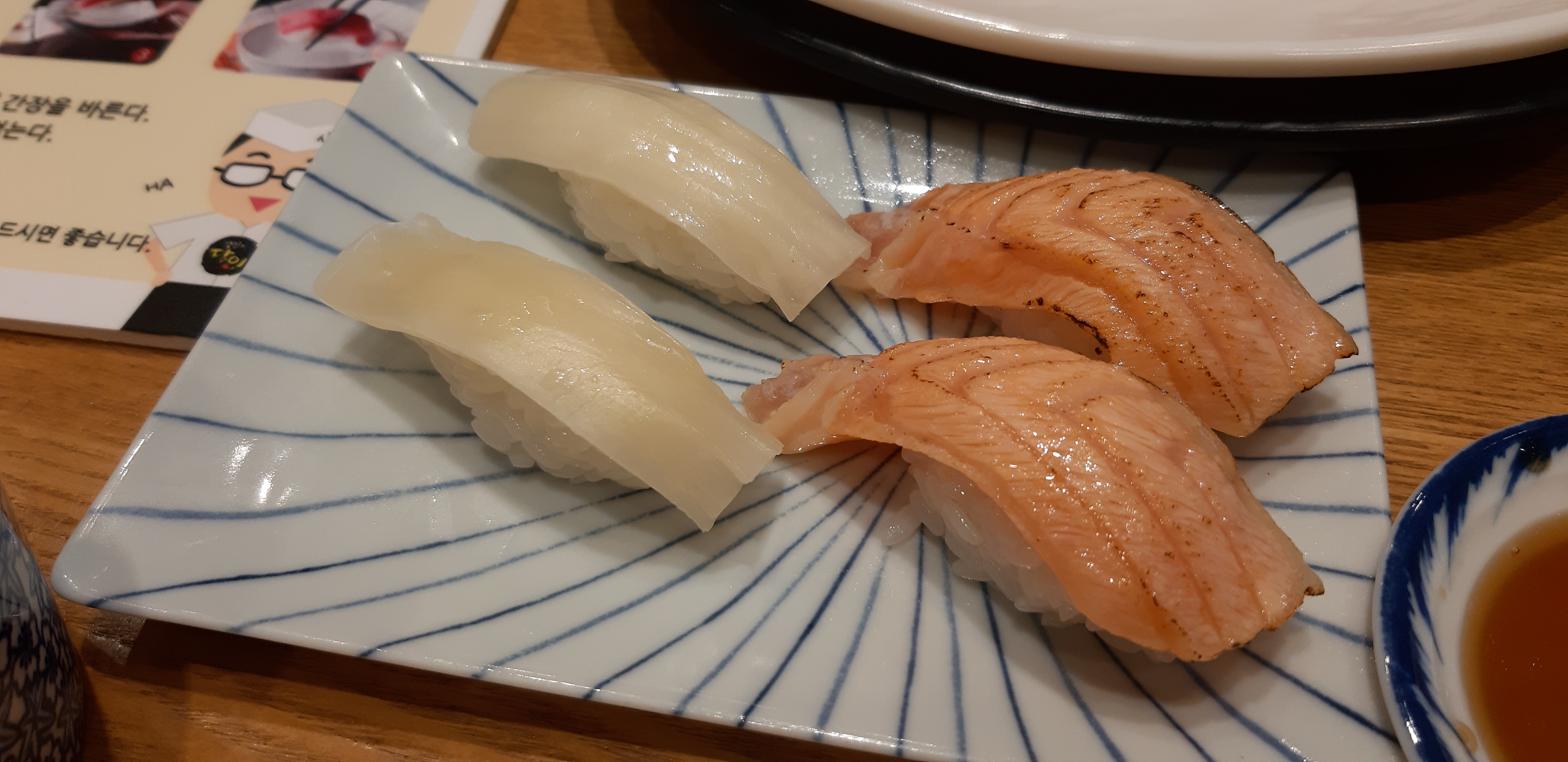 그리고 서비스로 우연히 받은 연어 타다끼가 너무 맛있었습니다. ㅠㅠ 본 메뉴인지는 모르겠으나 돈 주고라도 사 먹고 싶은 맛이네요. 김치 초밥은 그냥 평범하게 상상되는 그 맛입니다.