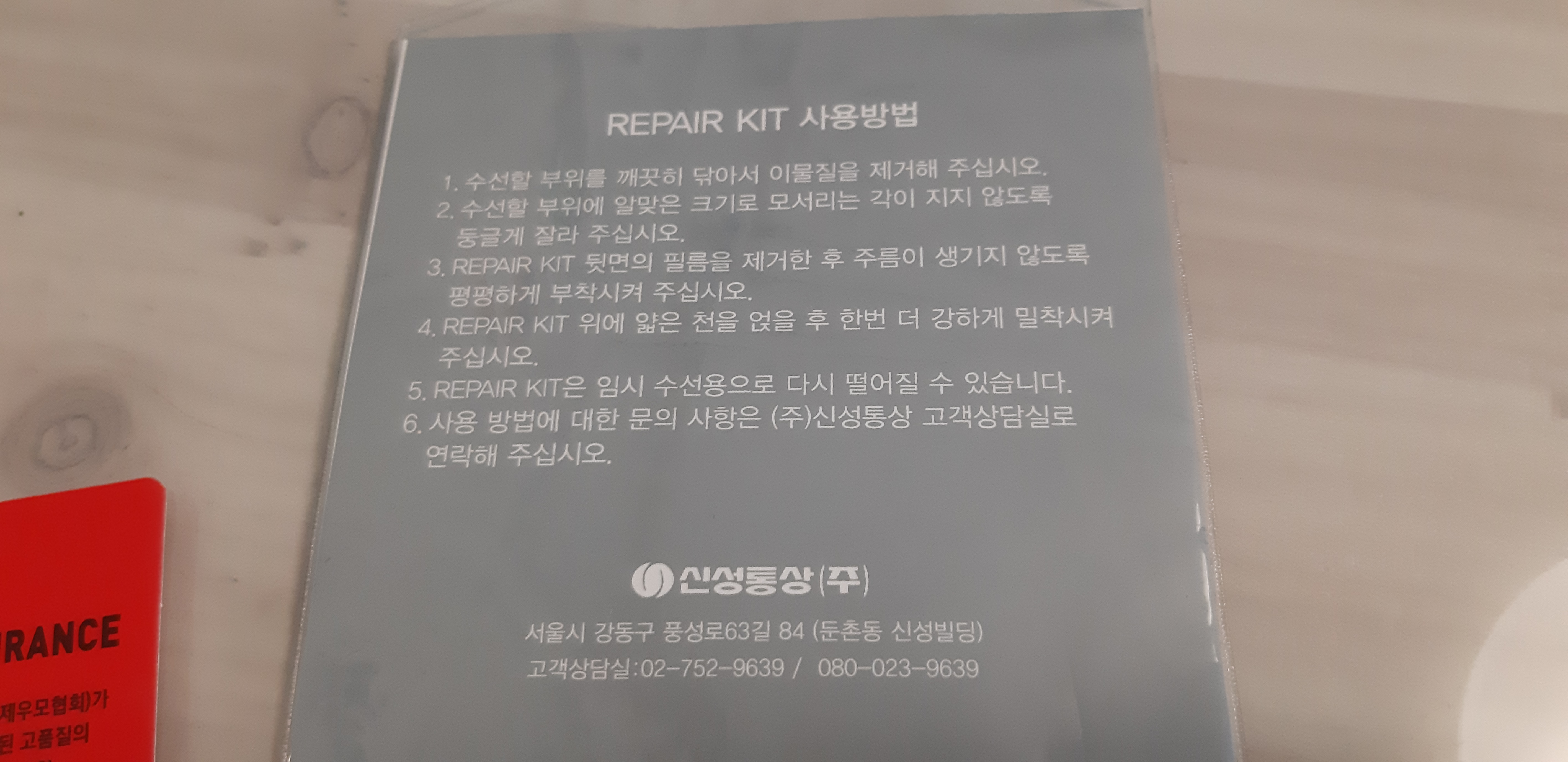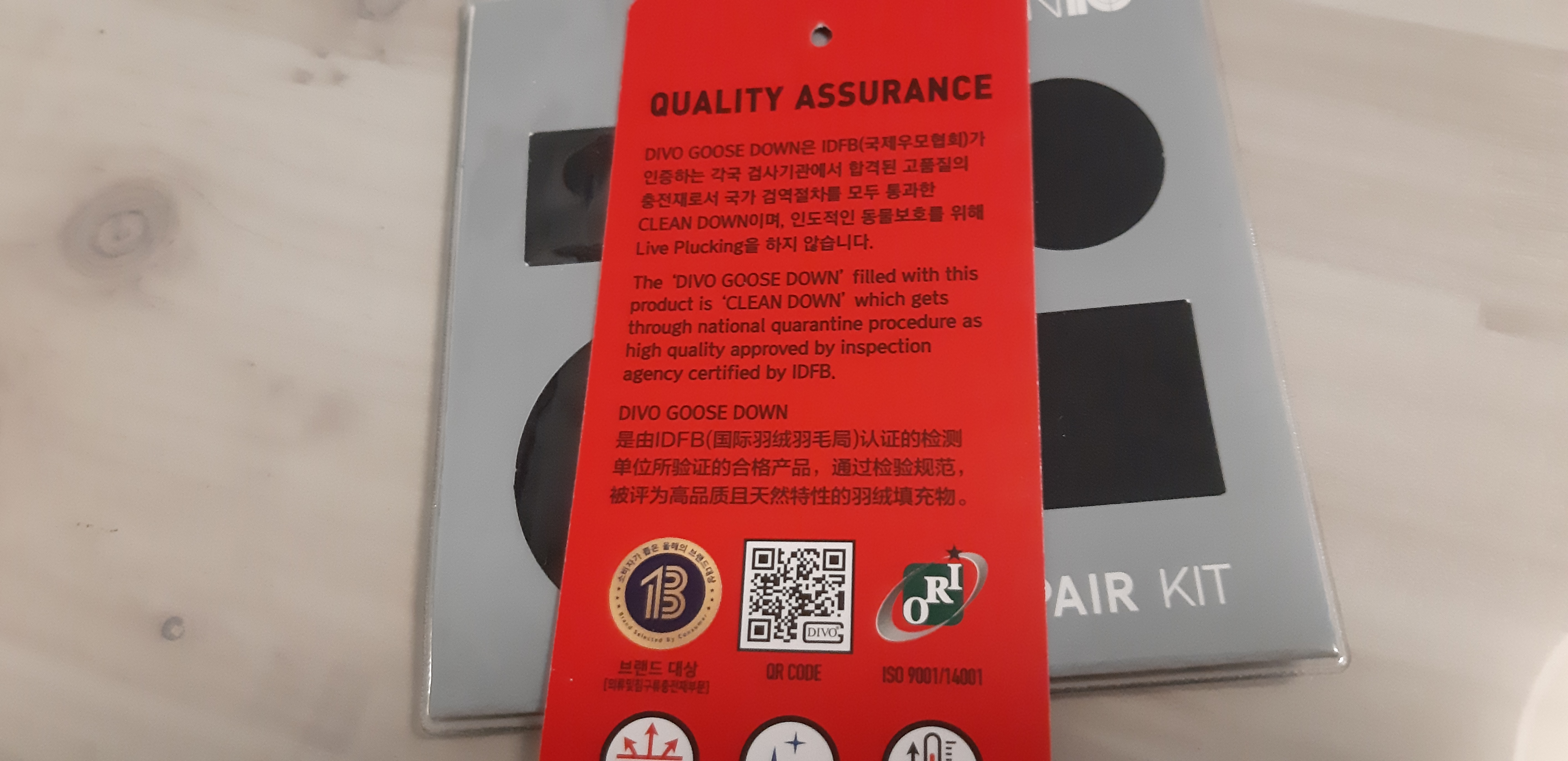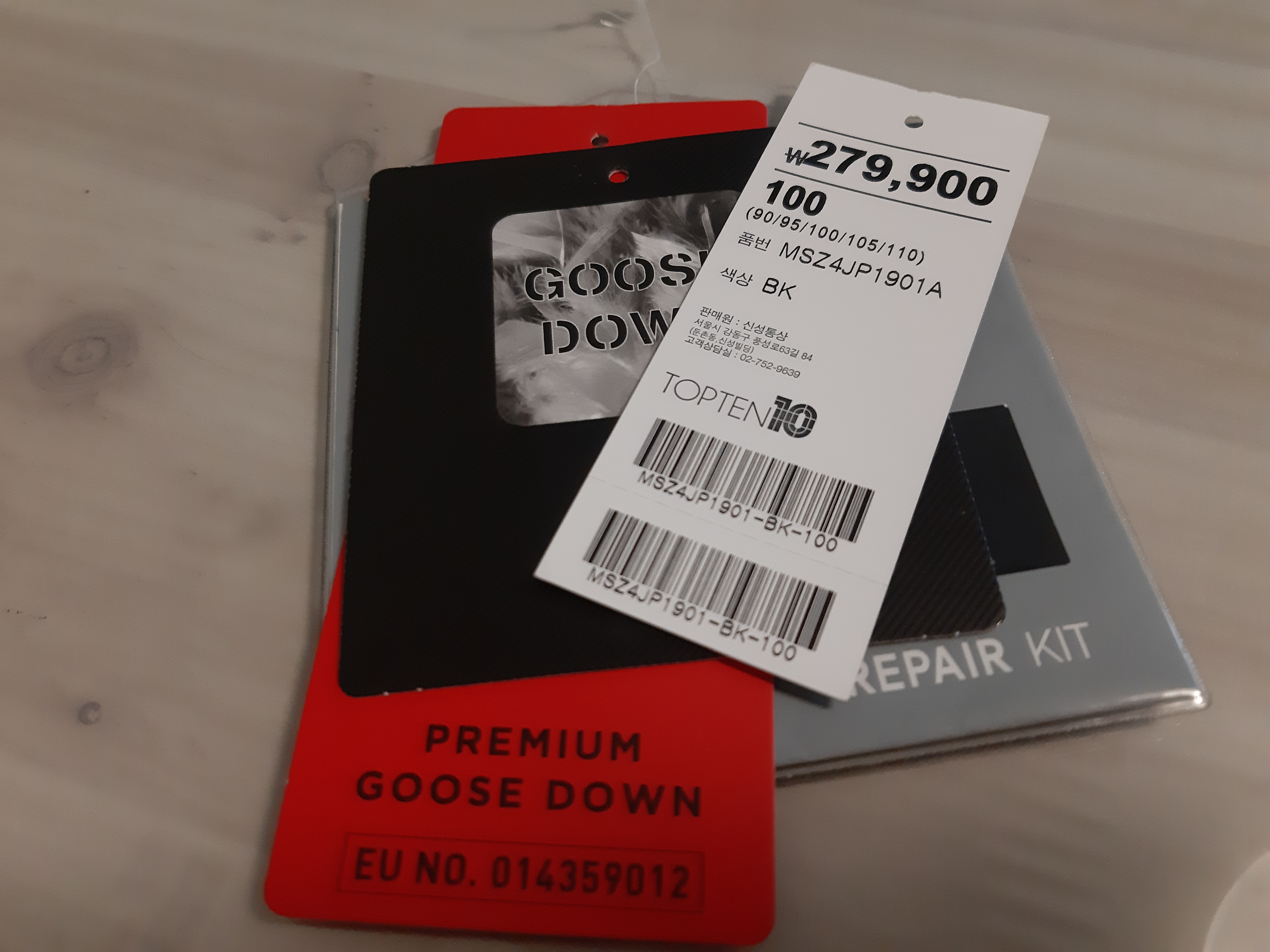 디테일 샷까지 포함할테니까 구매하실 때 참고하세요~그리고 추가로 리페어 키트라는 게 포함되어있었는데, 롱패딩에 구멍이 났을 때 임시로 붙여두는 패드인가봐요.