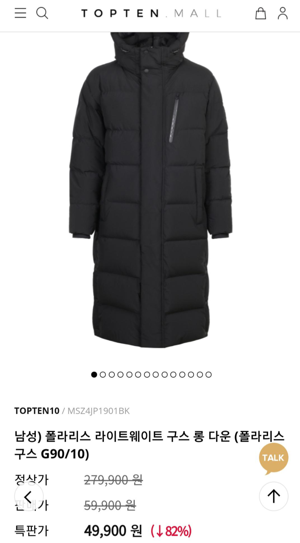 탑텐의 남성용 폴라리스 라이트웨이트 구스 롱 다운 (폴라리스 구스 G90/10) 입니다. 품번은 MSZ4JP1901A 예요.