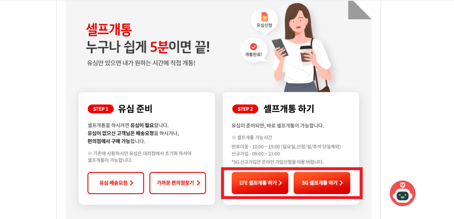 - [LTE 셀프개통] 또는 [5G 셀프개통] 선택