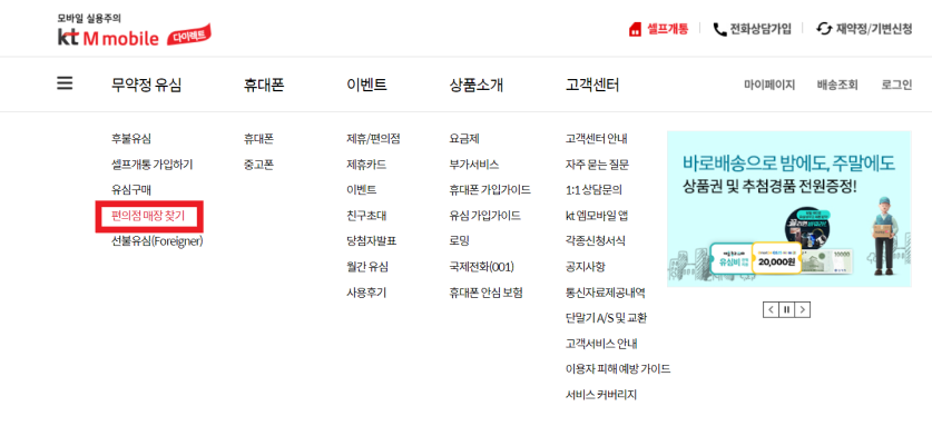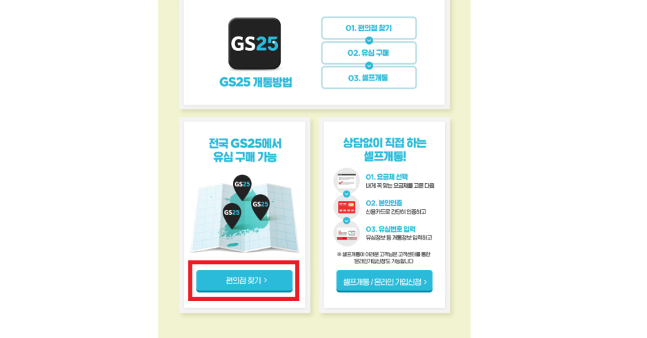 저는 편의점에서 유심을 구매했는데요, 오래 기다리기 싫고 당장 내가 개통을 시도해야겠다! 하는 분들께 추천드립니다. 저처럼 성격이 급한 분들이시라면요. 그럼 어느 편의점에서 유심을 팔지? 궁금하실 수 있습니다. 이 것도 사이트에 나와있습니다! 통신사 별로 다를 수 있지만 아무 편의점이나 들어가셔도 보통 유심을 판매하는 편입니다.