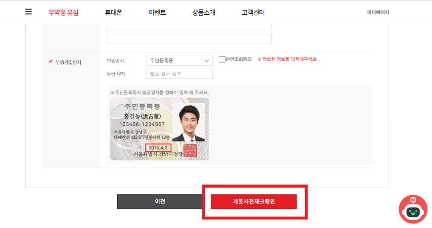 - 맨 밑 개통사전체크 확인 버튼 클릭