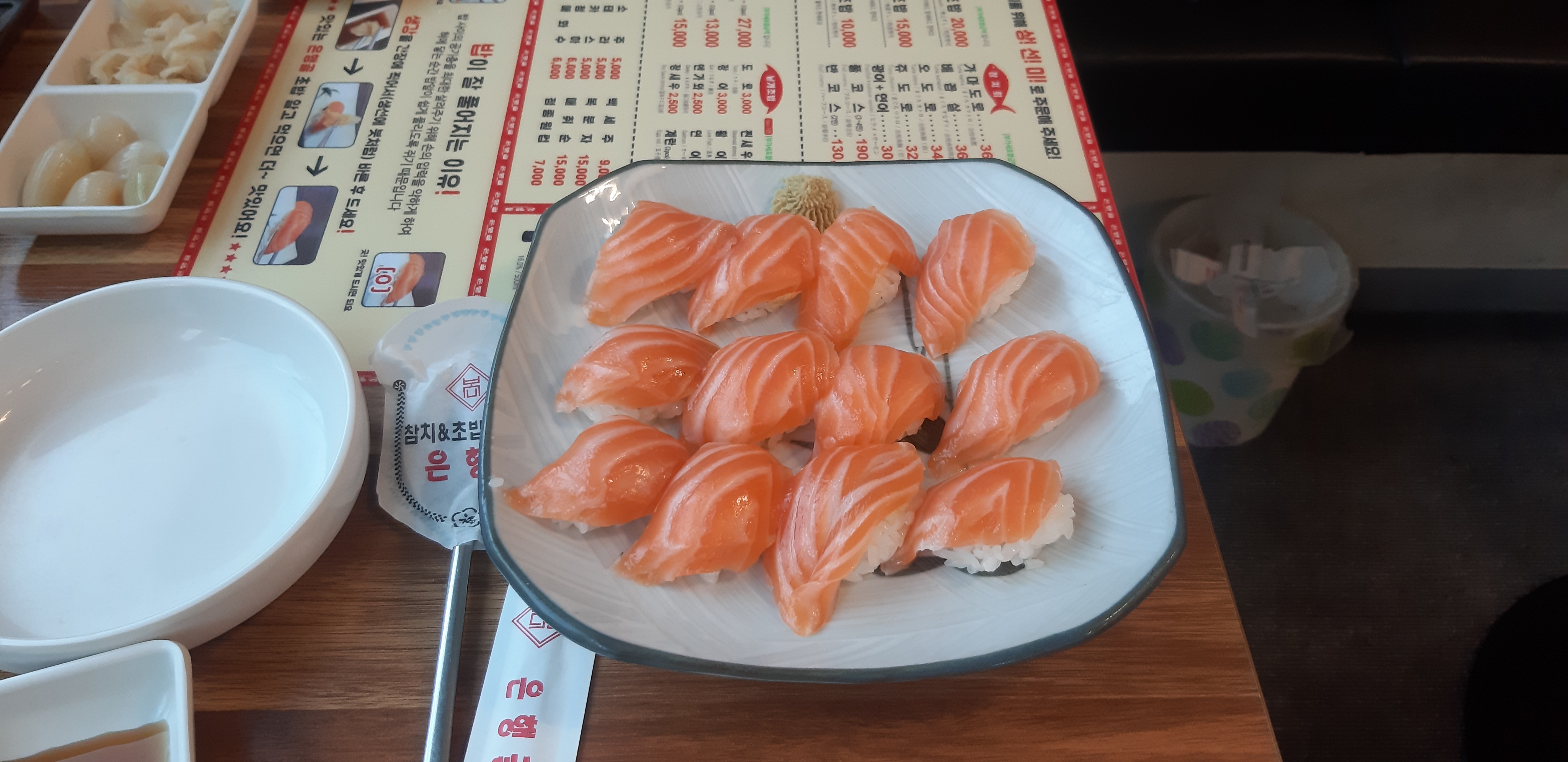 사담이 길었네요. 이제 메뉴판을 보여드릴게요. ㅎㅎ 저희는 연어 초밥 두 개를 주문했습니다. 1인 12 pcs 정도면 충분히 배부르게 먹을 수 있는 양이라 추가로 더 주문하지 않아도 되실 거예요.