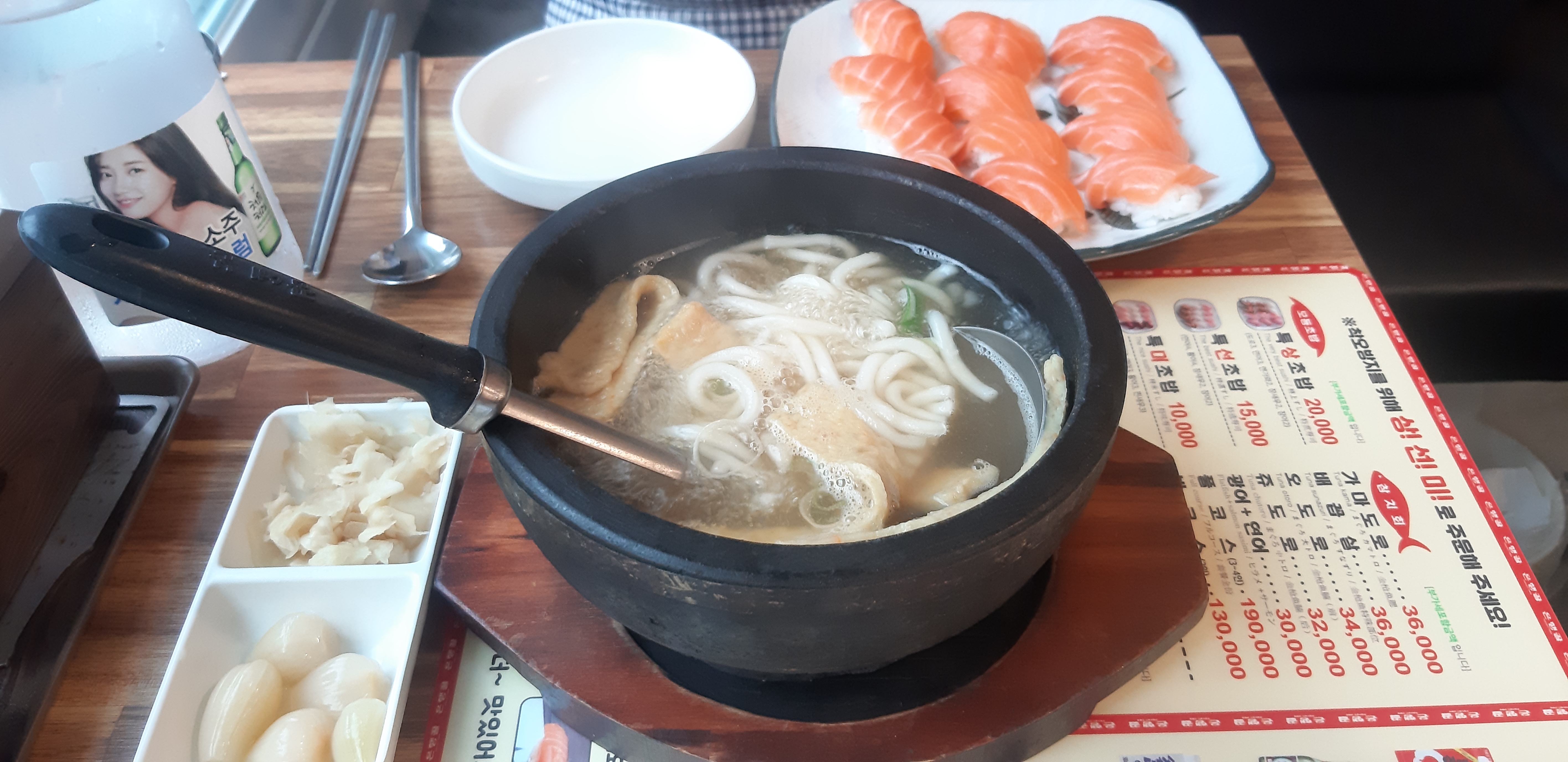 그리고 두 접시가 다 나왔을 때 서비스 우동이라며 뚝배기를 한 그릇 주셨어요. 특히 이게 너무 별미인 거예요. 사실 이 우동만 더 주문할 수 있나 하는 생각도 많이 했습니다. 안주로 너무 좋을 것 같습니다. 국물이 의외로 너무 맛있었어요! 서비스를 주신 것도 푸짐해서 좋았습니다.