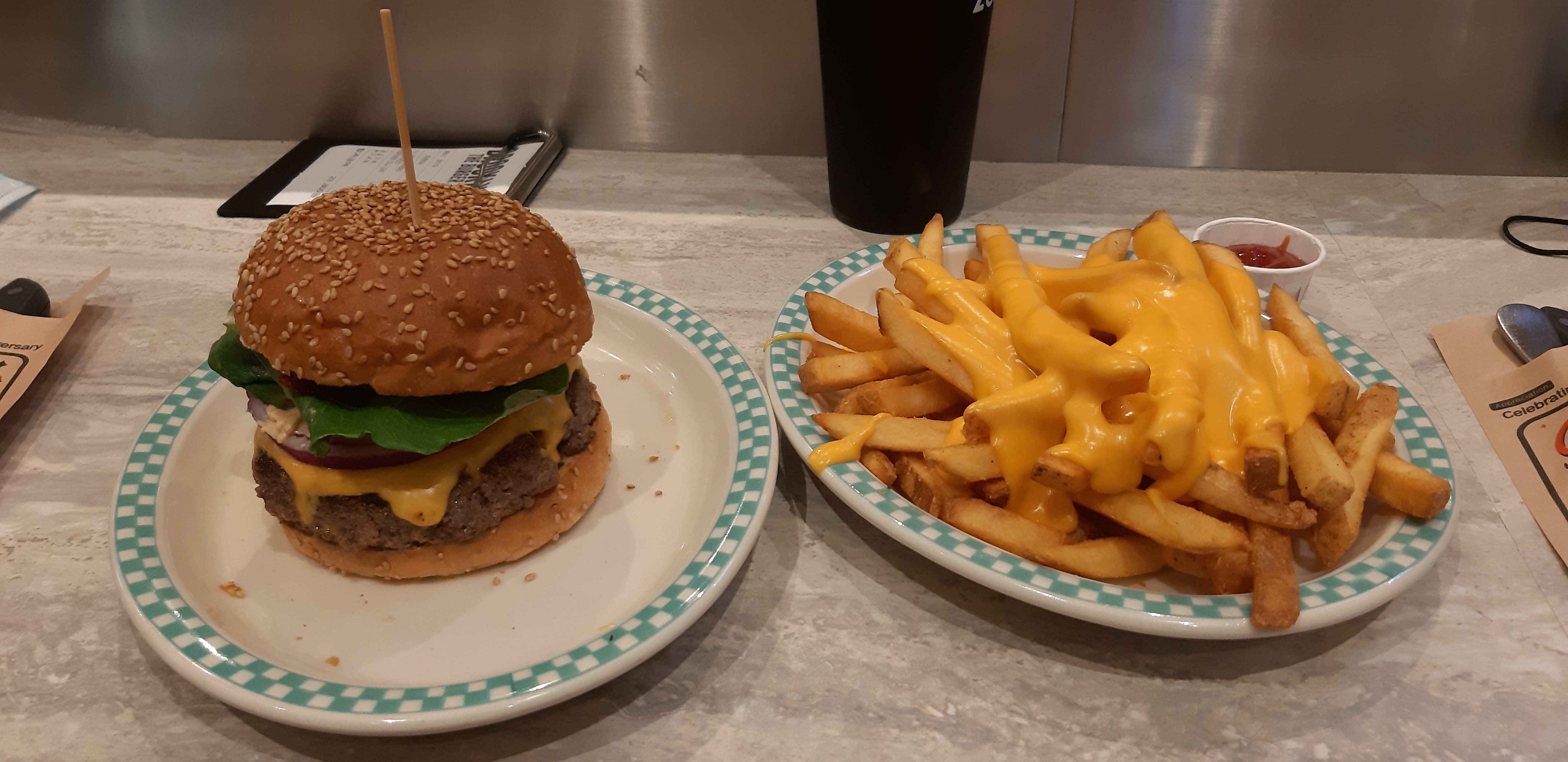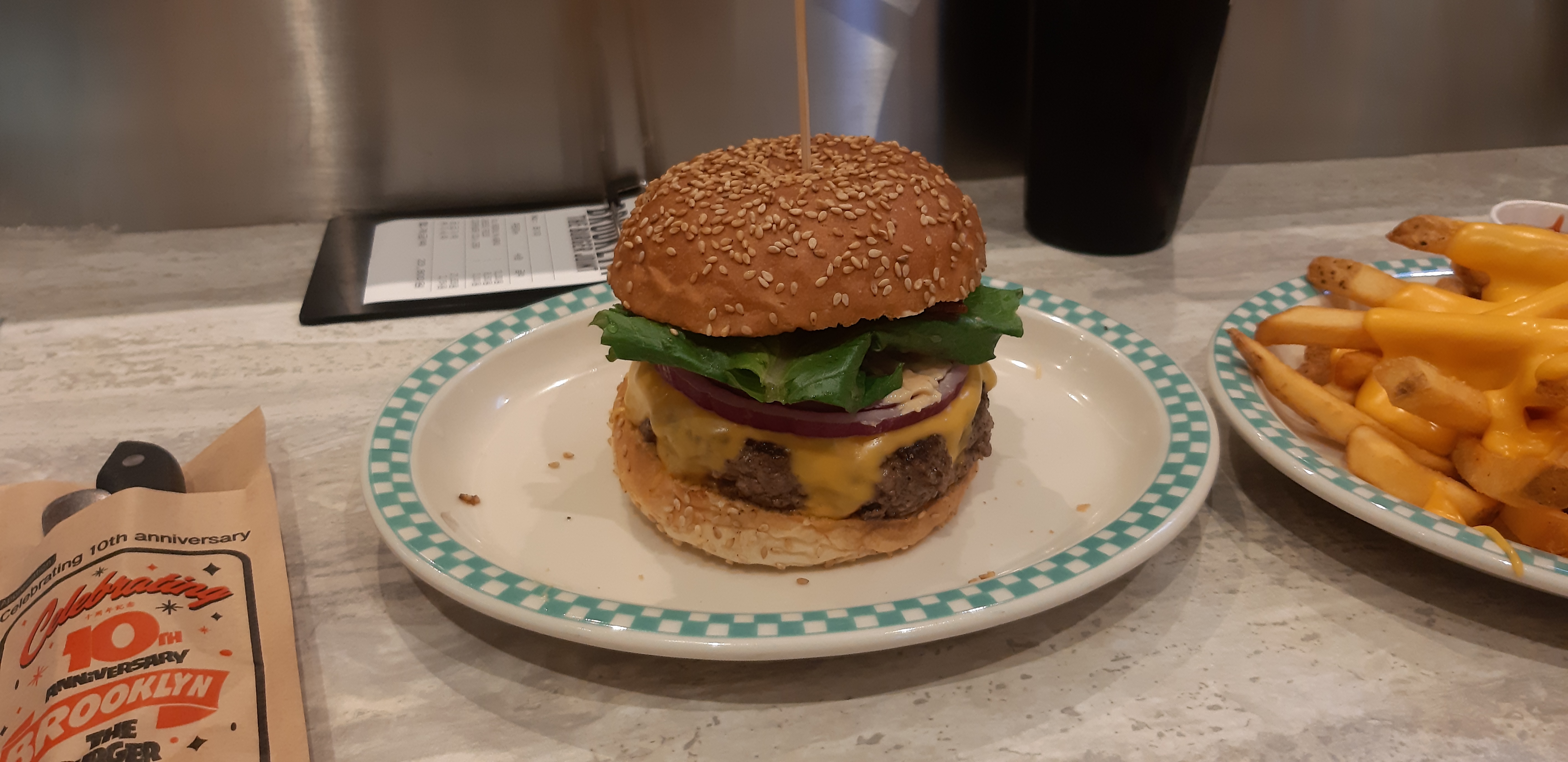 두 명이서 갔었는데, 출출하던 참에 갔던거라 버거 1 감자튀김 1 이렇게 적게 주문했습니다. 그래도 고기는 200g이랑 140g 중에서 선택이 가능하니까 양 조절하실 분들한테 선택권이 넓습니다. 브루클린 웍스 200g에 토마토와 피클을 빼 달라고 부탁드렸고, 감자튀김은 뭐니 해도 치즈 프라이즈가 최고죠.