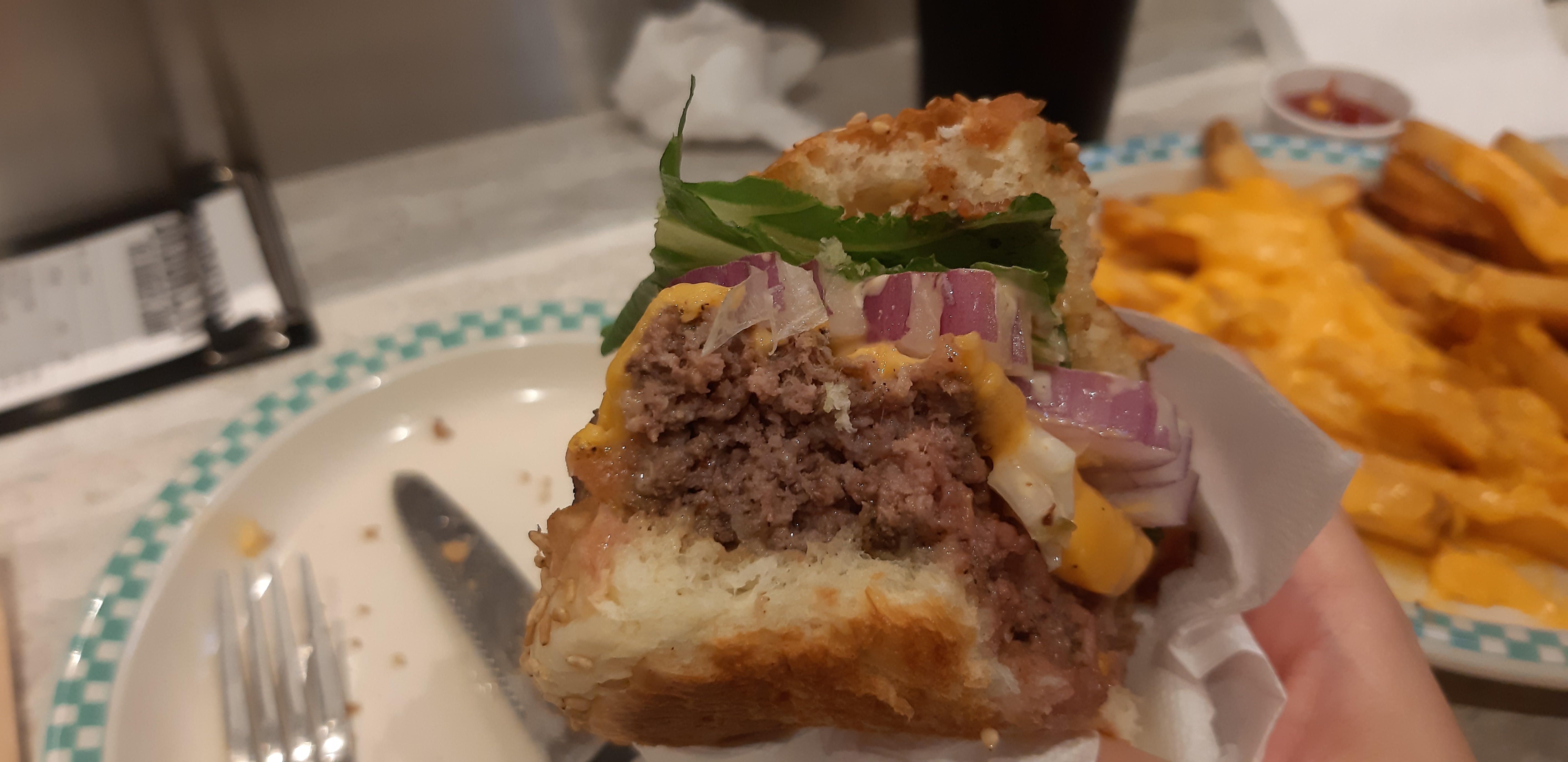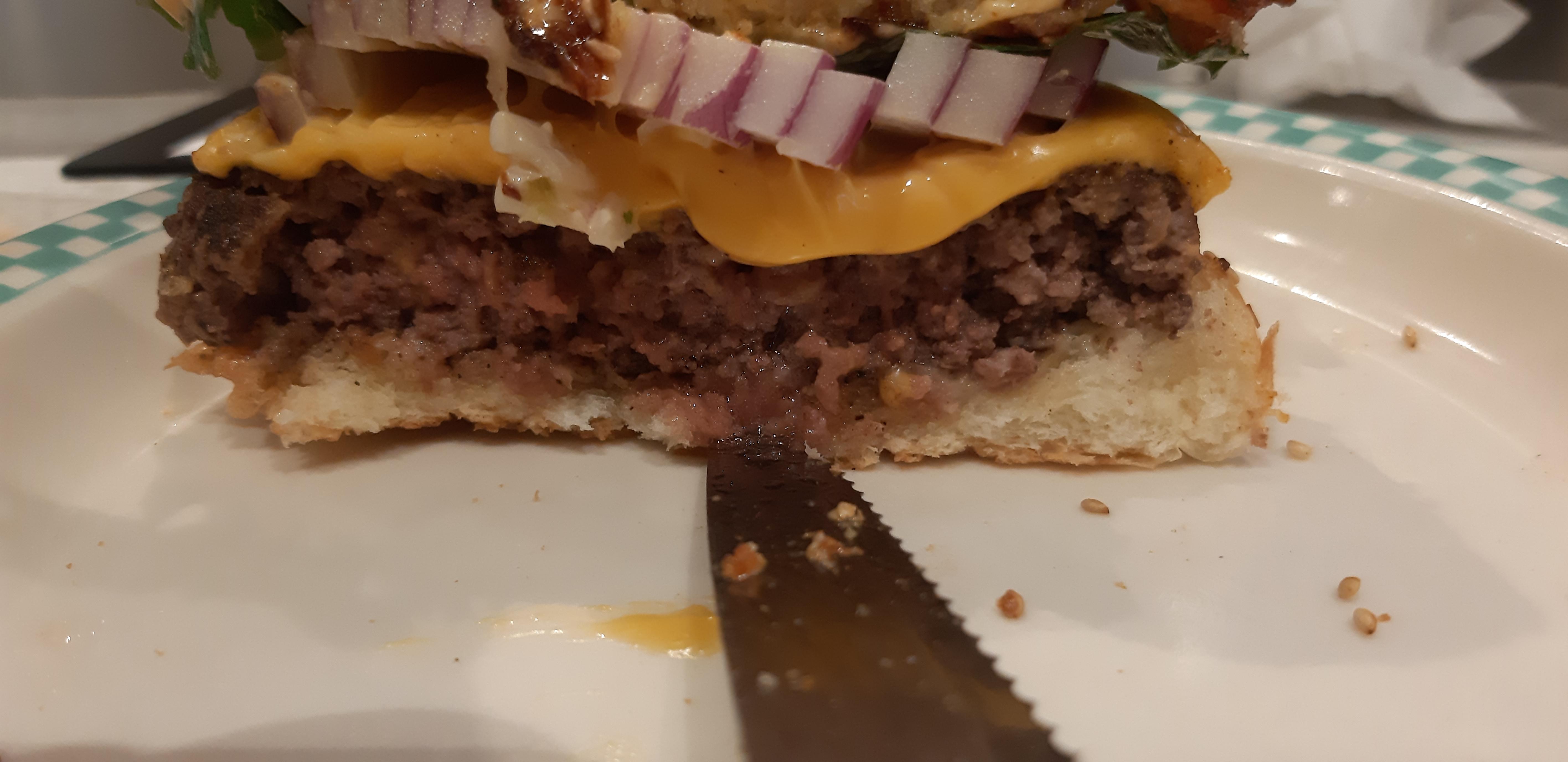 그래도 맛은 훌륭했습니다! 빵도 괜찮고 패티가 퍽퍽하지도 않고 부드러우면서 고소하고, 양파랑 궁합도 너무 좋았습니다. 그리고 사진을 찍어봤는데, 꾸욱 누르면 육즙이 흘러나와요. 맛은 합격입니다.