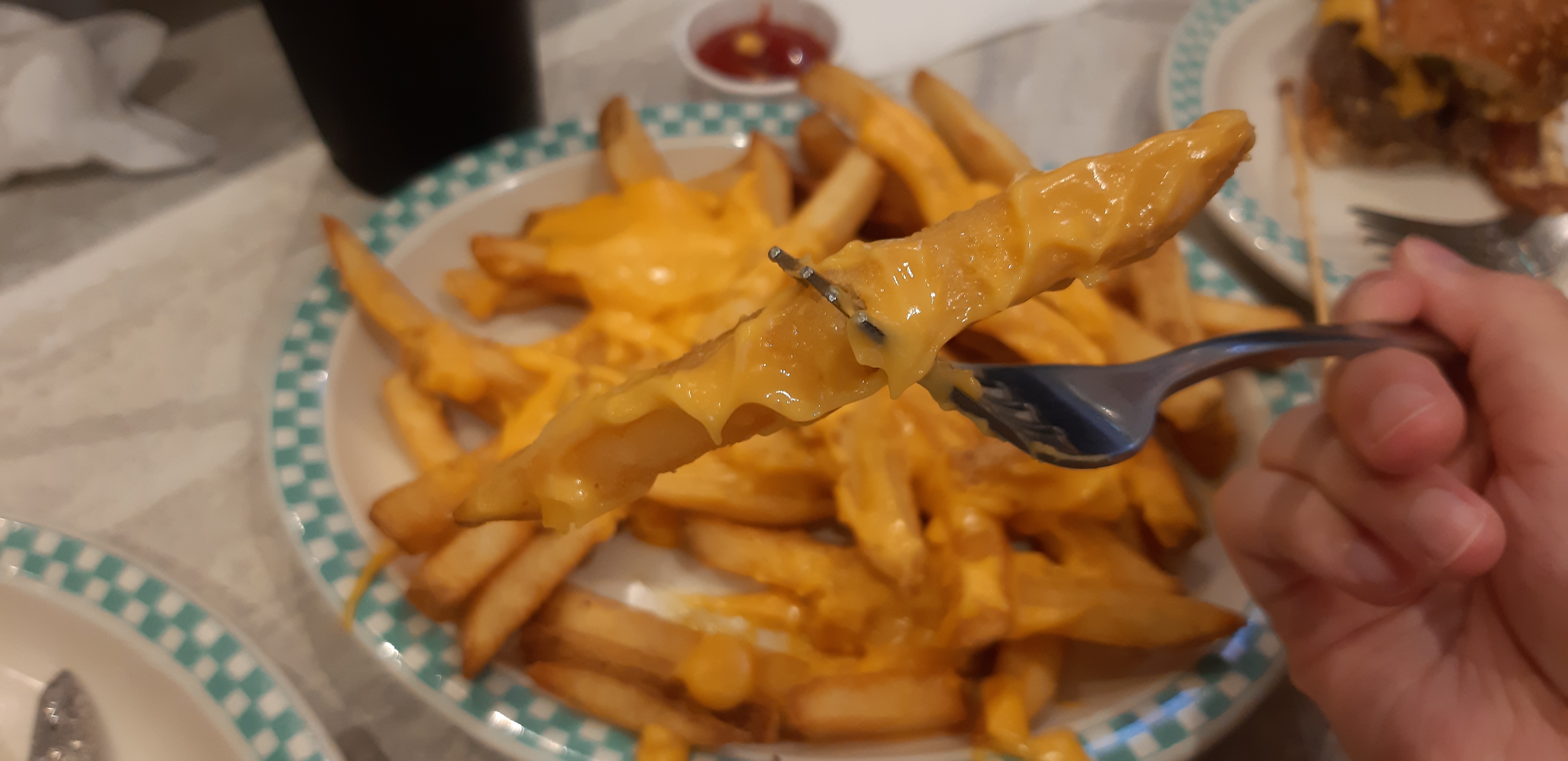 그리고 두 번째로 나온 감자튀김! 정말 양 많습니다..그리고 생각보다 굉장히 짭짤합니다.. 짠 거 못 드시는 분들은 소금을 적게 쳐달라고 하거나, (되는지는 모르겠습니다.) 안 시키시는 게 나을지도 몰라요. 하지만 전 짜게 먹는 편에 이런 체다 치즈가 흐르는 감자튀김을 정말 좋아해서 배 아플 때까지 먹었습니다. 사실 개인적으로 버거보다 저 감자튀김만 배달시켜서 먹고 싶어요. ㅠㅠ 양이 진짜 많아서 비슷하게 아웃백에도 있는 오지치즈 프라이가 생각났는데, 그것보다 낫습니다!! 왜냐하면 아웃백 오지치즈 프라이는 너무 치즈가 잘 굳고 금방 식고, 그러면 거의 치즈를 뜯어서 먹어야 하거든요. 먹기가 힘들고 질겨요. 물론 치즈가 달라서 그런 것도 있지만, 저는 저렇게 안 굳고 소스 같은 치즈가 더 좋더라고요.