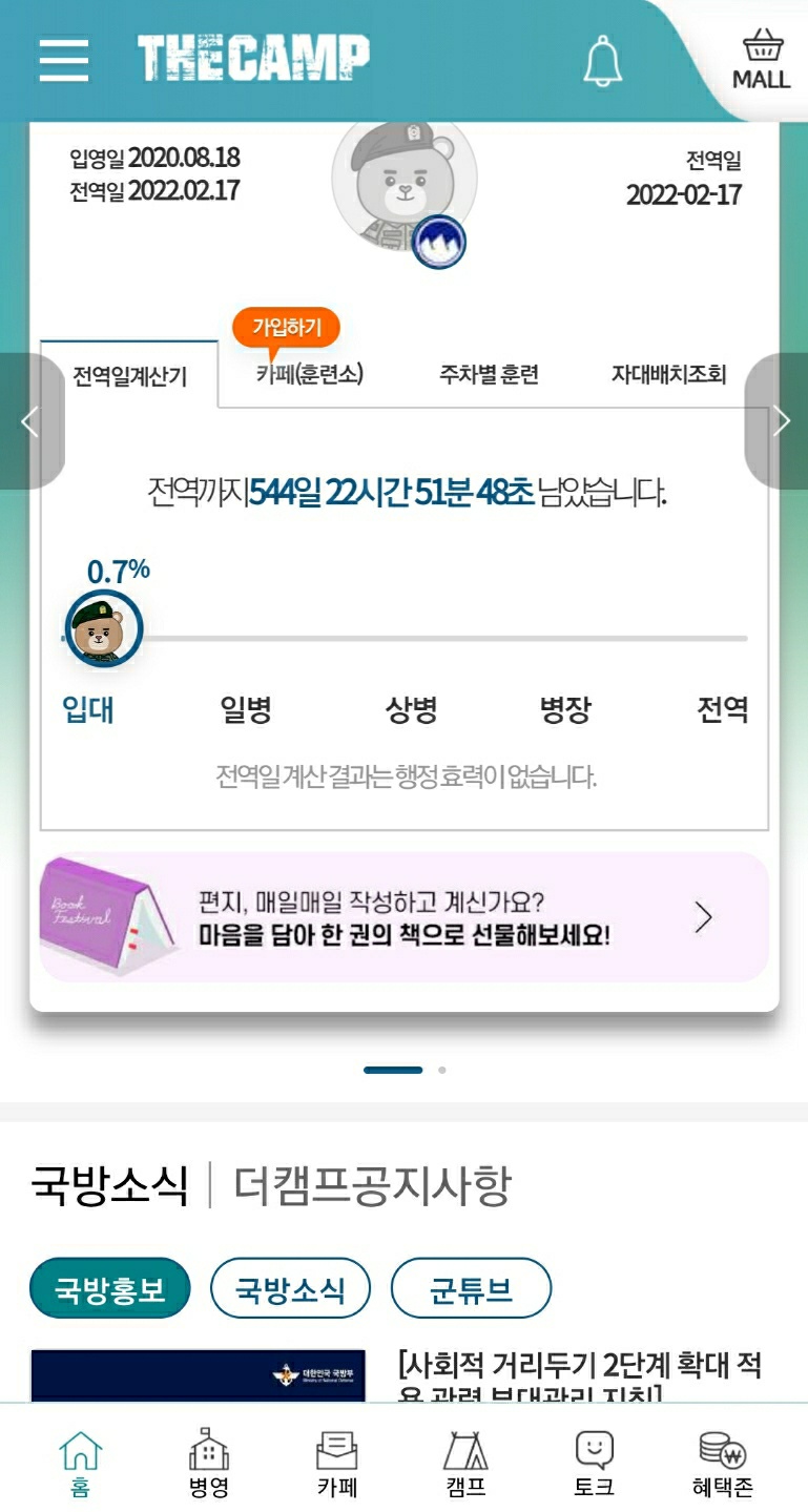 그러면 이렇게 전역일 계산기도 되고, 훈련소의 카페랑도 연결되고, 몇주차 훈련인지까지 다양한 정보가 뜹니다.