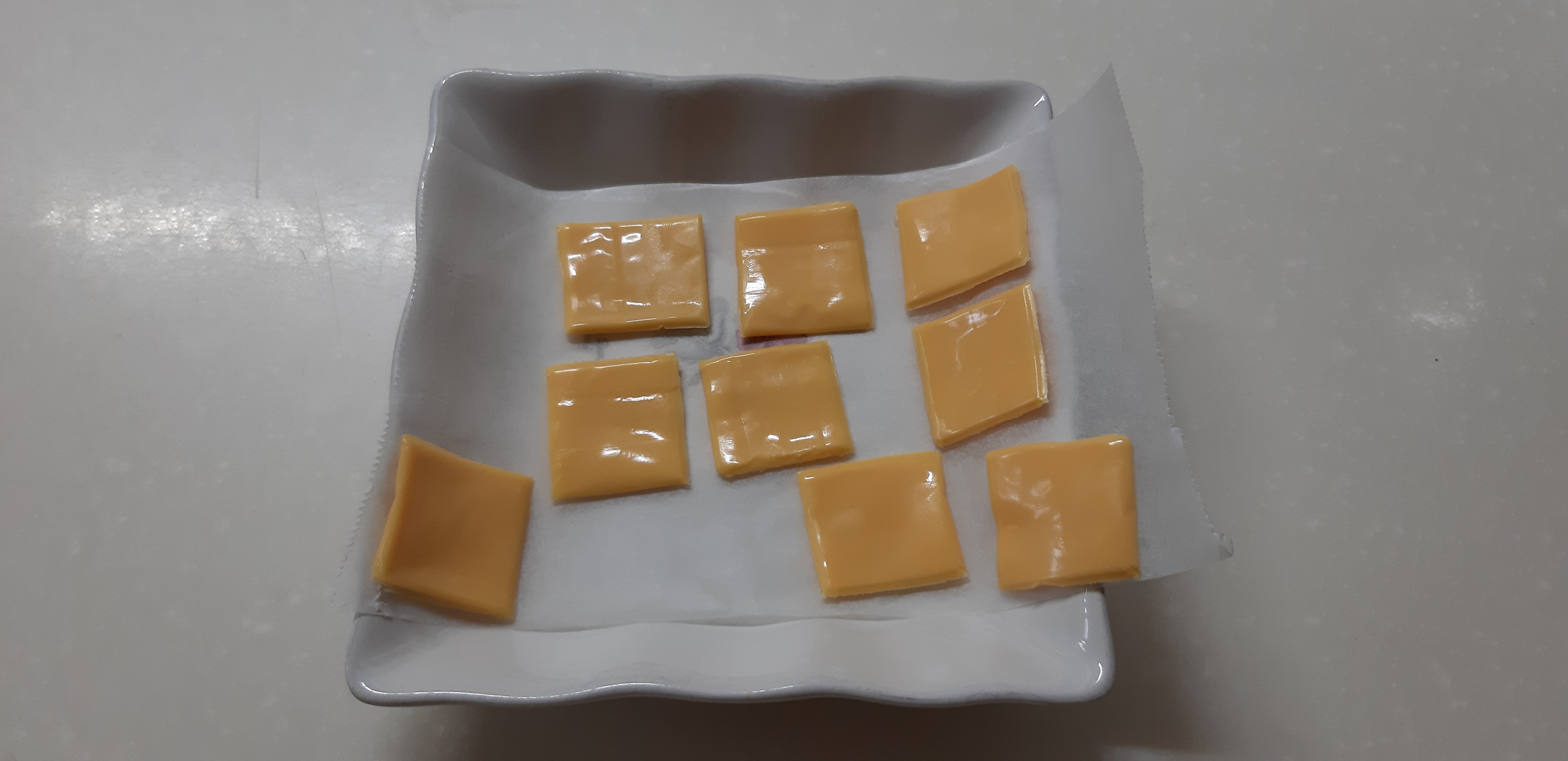 그리고 적당하게 유산지를 잘라서 그 위에 치즈 조각들을 펼쳐줍니다. 살짝 씩 붙지 않게 간격을 띄워서 배치해주세요.