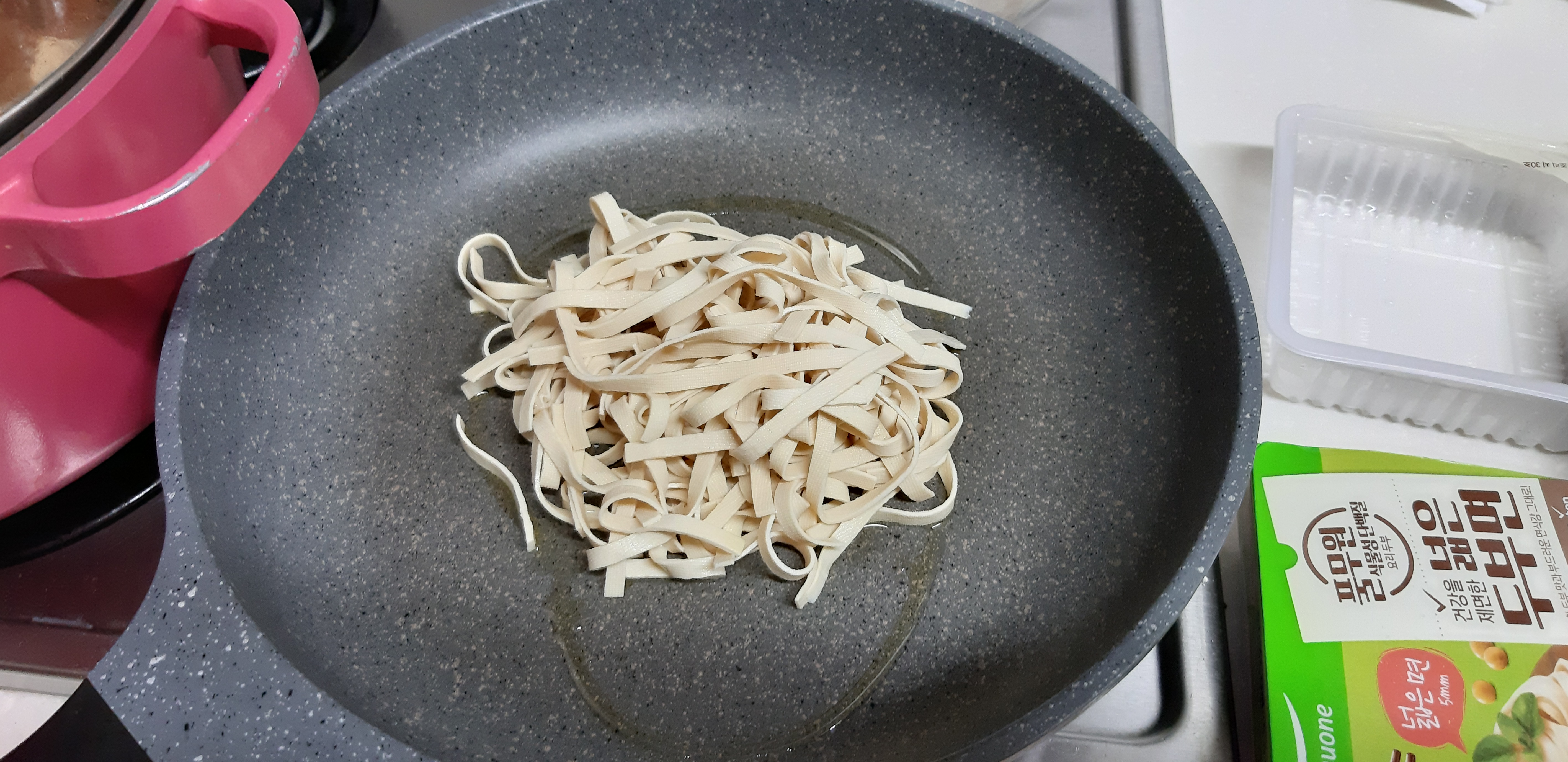 저는 최근에 빠진 마켓 컬리의 풀무원 두부면 넓은 면을 사용했습니다. 괜찮은 두부면은 풀무원뿐인 것 같아요. 다른 곳에서 판다는 링크는 잘 안보이더라고요. 두부면이라 신선함을 유지하기 위해 용기 안에 물이랑 두부면이 같이 채워져 있는데, 이 물을 전부 빼주시고 미지근한 물에 세 번 정도만 헹궈주세요. 어차피 밀가루가 없으니 크게 신경 안 쓰셔도 됩니다.
