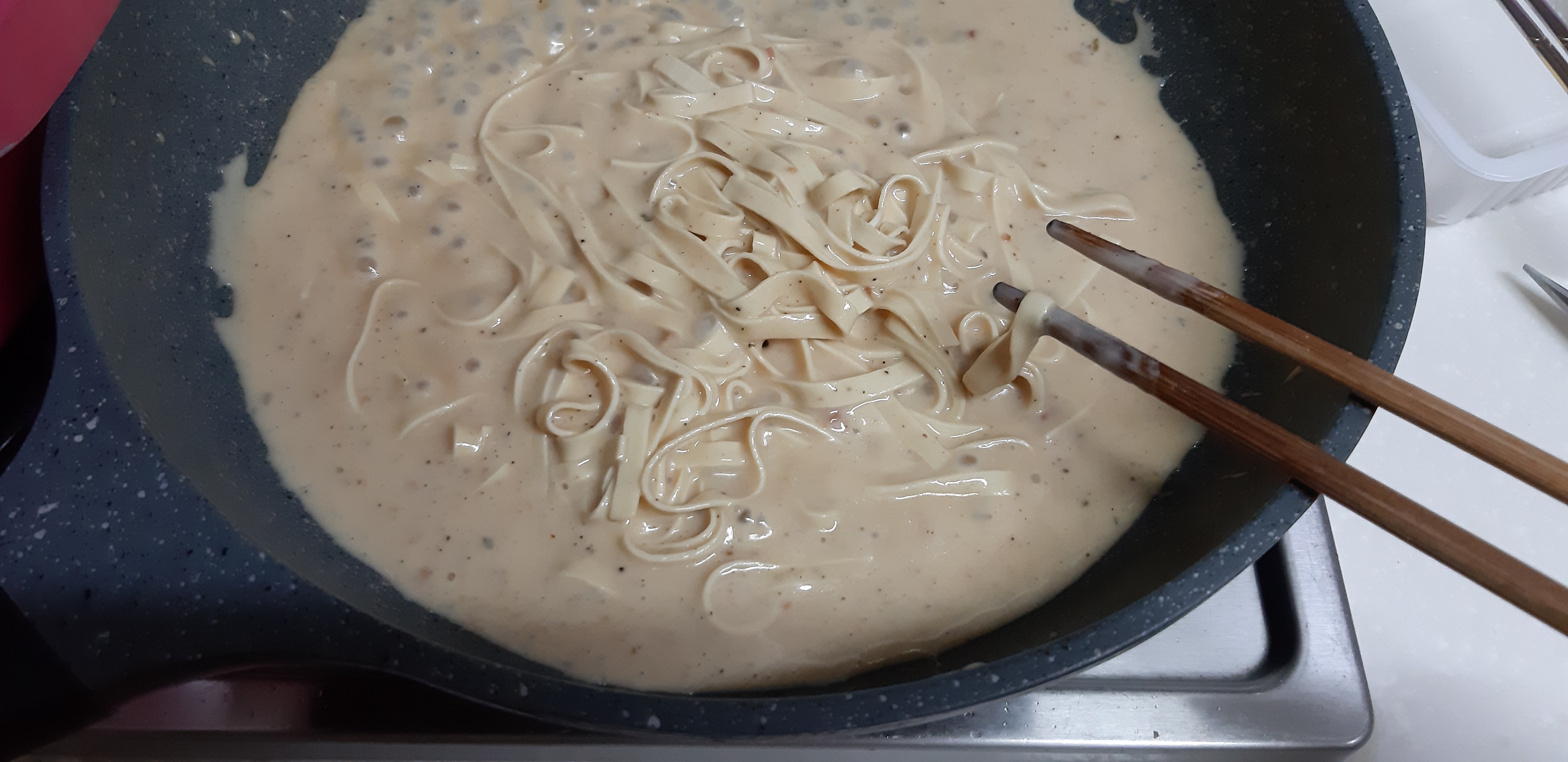 그리고 프라이팬에 올리브유를 두 바퀴 정도 둘러주시고 중불로 가열해주세요. 여기에 헹군 두부면과 크림소스를 같이 넣어주세요. 그리고 후추를 취향만큼 뿌려줍니다. 저는 후추를 꽤 좋아해서 매운맛을 위해 크게 두 번 휘둘렀습니다. 그리고 약 7분 동안 중불에 계속 졸여주시면 됩니다. 제가 사용한 시판소스는 이마트의 크림 소스였습니다. 참고하세요~